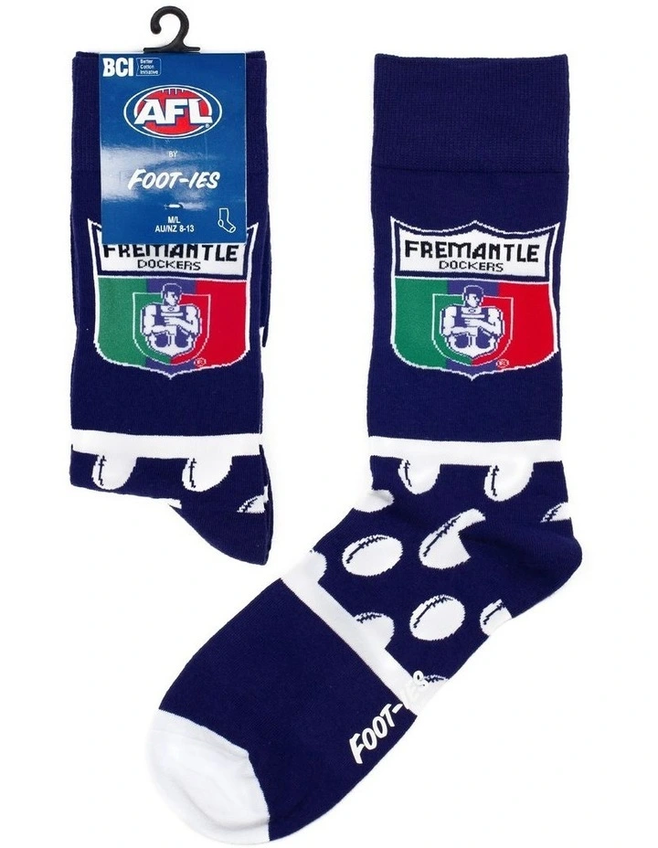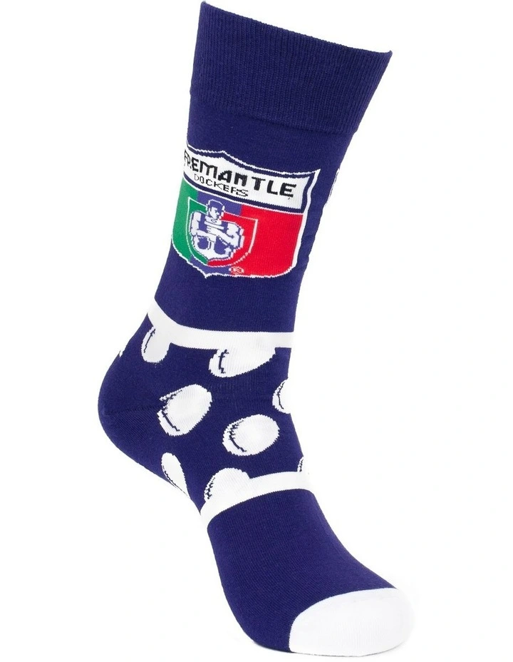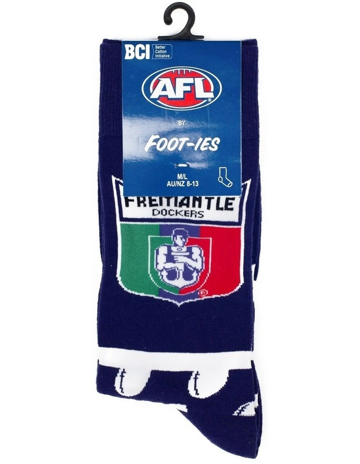 Support the Fremantle Dockers in your favourite team colours with these officially licensed AFL socks from the boardroom to the big day. Foot-ies use a premium blend of cotton, polyamide and elastane fabrication with a market leading 200 needle construction. This ensures they maintain their comfort, fit and colour and also allows for detailed graphics of your favourite team! This sock is a mid rise crew sock with comfort heal gusset to ensure the perfect fit. Australian owned and designed in Melbourne. Warm machine wash for best results to keep your AFL team colours vibrant!