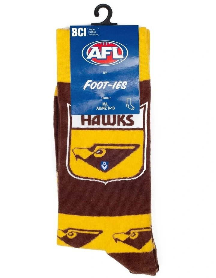 Show your Hawthorn Hawks team colours everyday of the week in these officially licensed AFL x Foot-ies socks. Foot-ies use a premium blend of cotton, polyamide and elastane fabrication with a market leading 200 needle construction. This ensures they maintain their comfort, fit and colour and also allows for detailed graphics of your favourite team! This sock is a mid rise crew sock with comfort heal gusset to ensure the perfect fit. Australian owned and designed in Melbourne. Warm machine wash for best results to keep your AFL team colours vibrant!