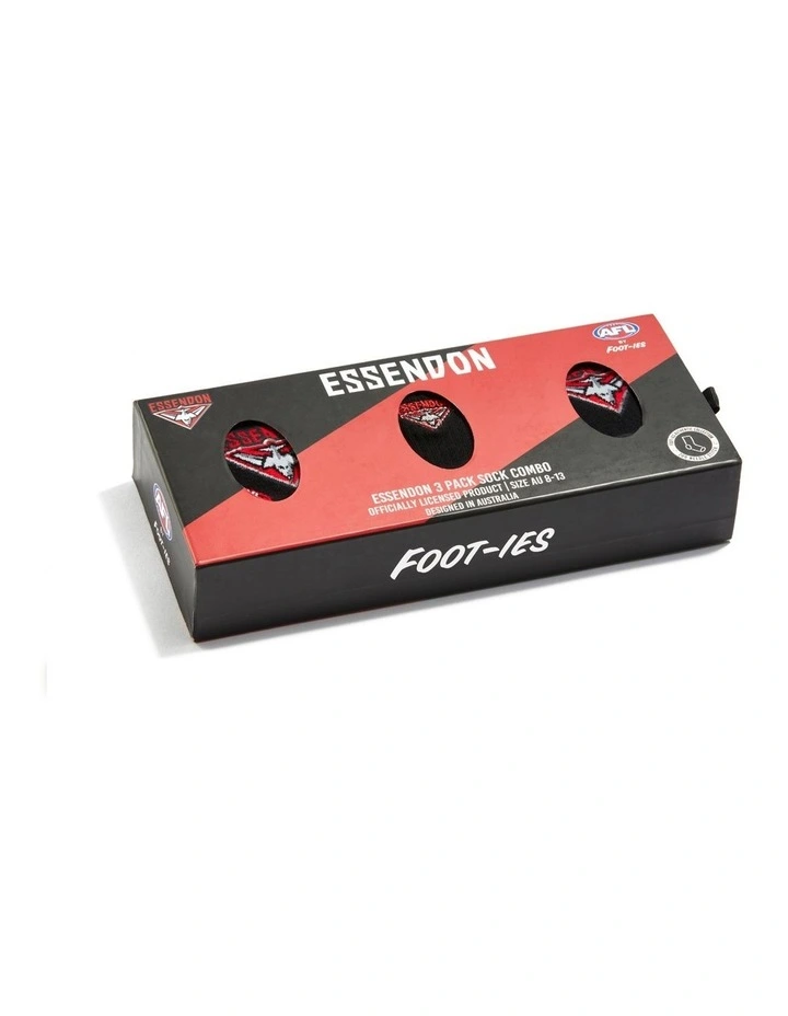 Officially licensed by the AFL, these Foot-ies 3 pack gift box contains 2 business socks and one sneaker sock. Business socks are made use a premium blend of cotton, polyamide and elastane fabrication with a market leading 200 needle construction. The Sneaker sock is from a careful blend of 68%cotton, 25% polyester and 7% elastane and both are a crew length fit. Packaged in a beautiful quality gift box these Australian designed socks are a great way to show your Essendon Bombers team colours!