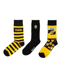 Officially licensed by the AFL, these Foot-ies 3 pack gift box contains 2 business socks and one sneaker sock. Business socks are made use a premium blend of cotton, polyamide and elastane fabrication with a market leading 200 needle construction. The Sneaker sock is from a careful blend of 68% cotton, 25% polyester and 7% elastane and both are a crew length fit. Packaged in a beautiful quality gift box these Australian designed socks are a great way to show your Richmond Tigers team colours!