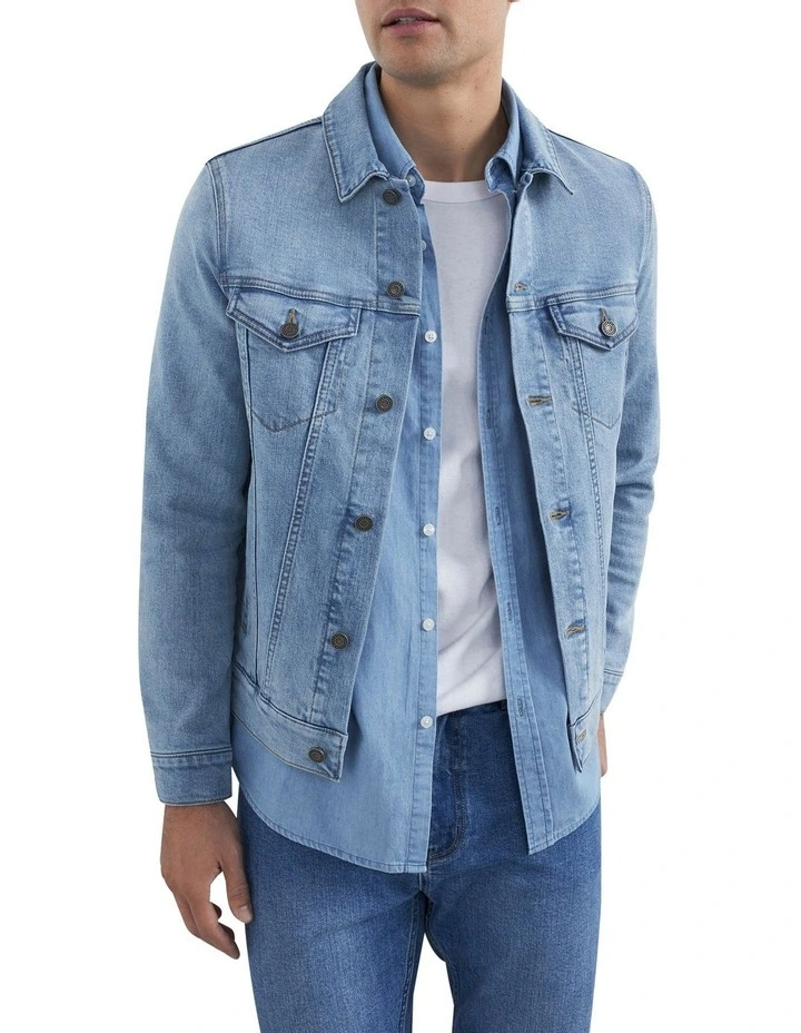 Keep warm on those cooler summer nights with our Denim Jacket. Made from light wash denim, this stylish jacket features a side seam pockets, silver shank buttons and a comfortable regular fit. Pair with our Slim Tapered Jeans and Classic Crew Neck T-Shirt. Our model is 188cm tall and wears a size AU M.