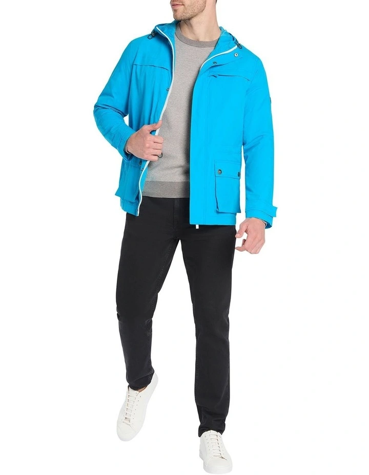 Creating an effortless layer in bright aquarelle blue, this parka jacket delivers regular shaping within a soft cotton blend, while offering added warmth with mesh lining. Featuring a full hood with adjustable elasticated toggles, the jacket fastens at the front with a chunky white zip and snap buttons, finished with four pockets up front, handy tabs at the cuff and an elasticated waist.