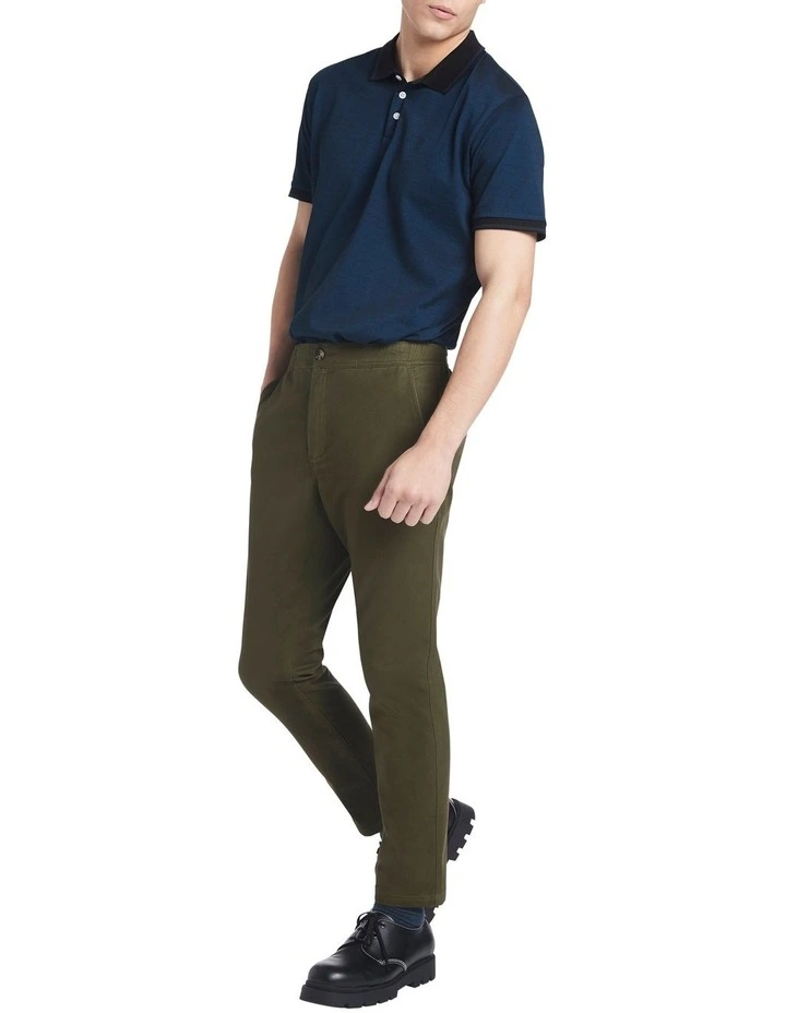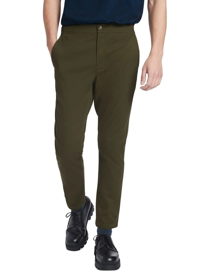 Revealing a khaki merlot hue, these chinos show off a sueded look made from soft cotton twill, featuring just a hint of stretch for comfort and movement. Fastening at the front with a concealed fly and tortoiseshell button closure, the pants descend through tapered leg shaping to full length, finished with an elasticated back waistband, and pocketing front and back.