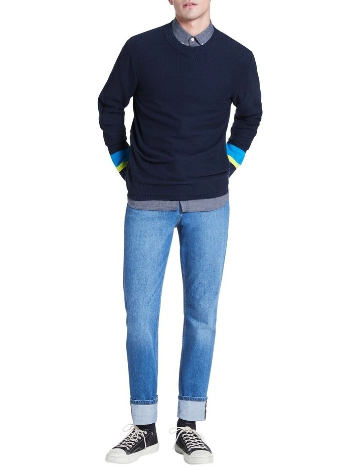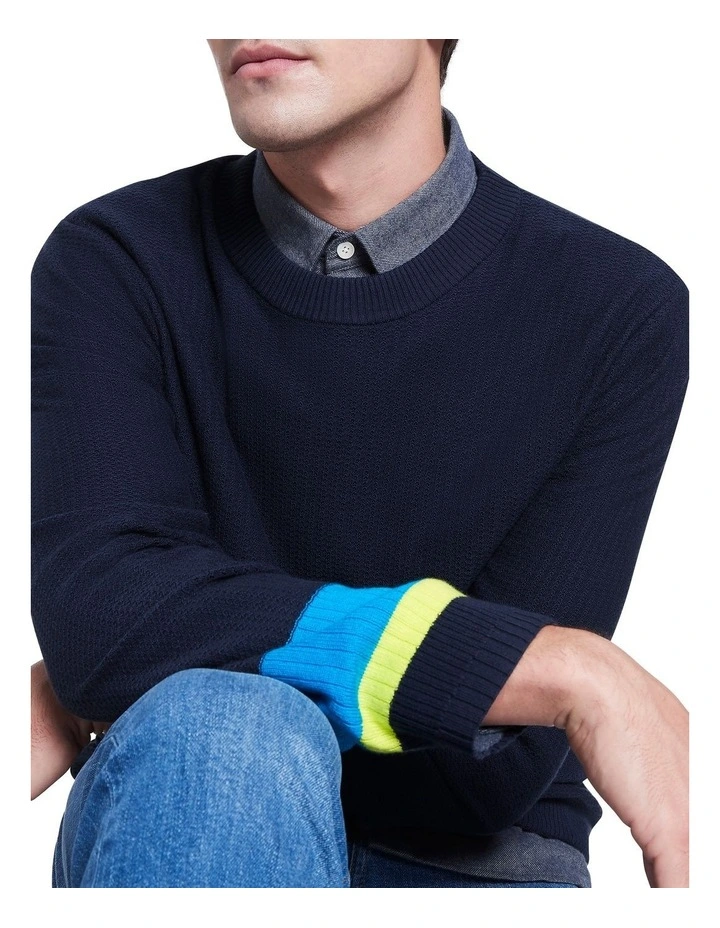 Effortless in navy, this regular fit knit sweater creates a look that you can simply pull on and go, elevated by contrast stripe detailing at the cuffs. Made from soft yarn, the sweater reveals a textured vertical rib through the front of the body and sleeves, finished with fine rib trim at the crew neckline, cuffs and straight body hem.
