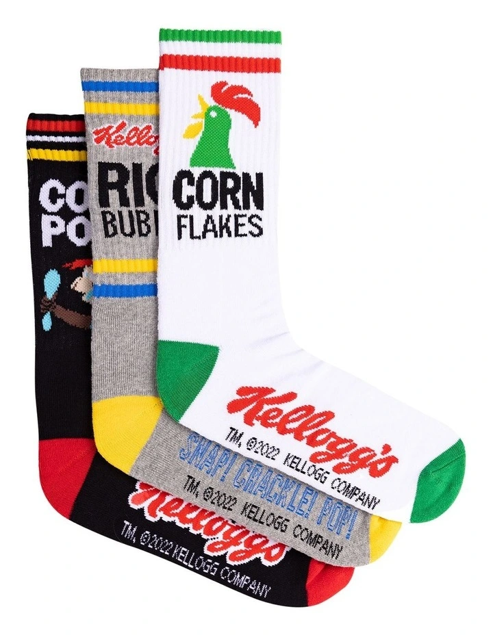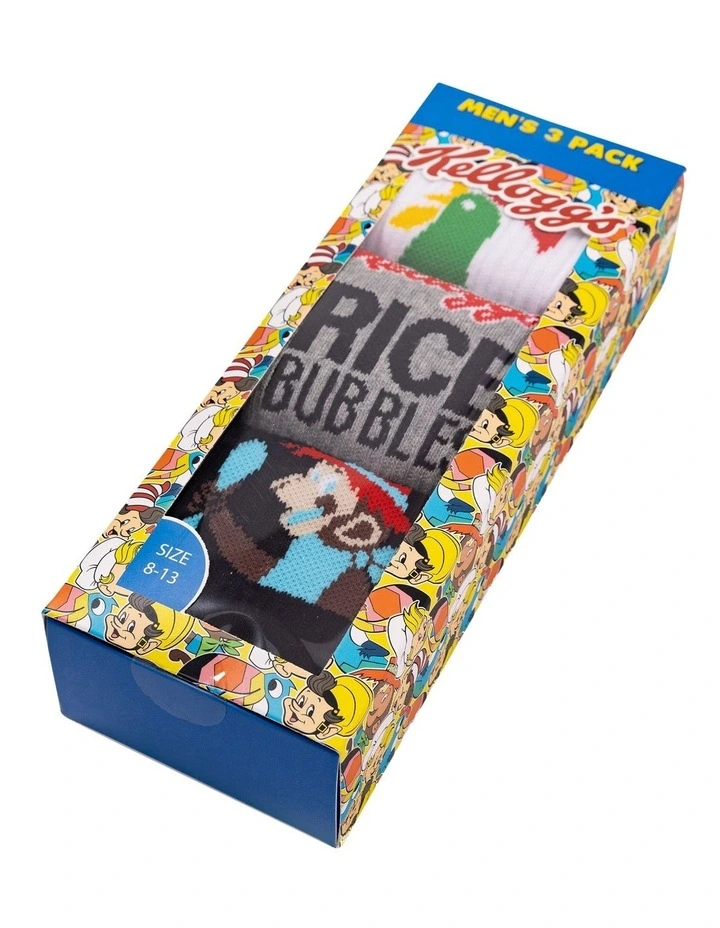 These Fun Mens Officially Licensed Kelloggs Variety Cotton Sport Crew Sock 3 Pack feature your favourite Kellogg’s brand cereals. Crafted from a soft cotton blend rib construction and features a cushioned foot for extra comfort. They add a sporty touch and are perfect for everyday wear and are an ideal gift for birthdays and Christmas.