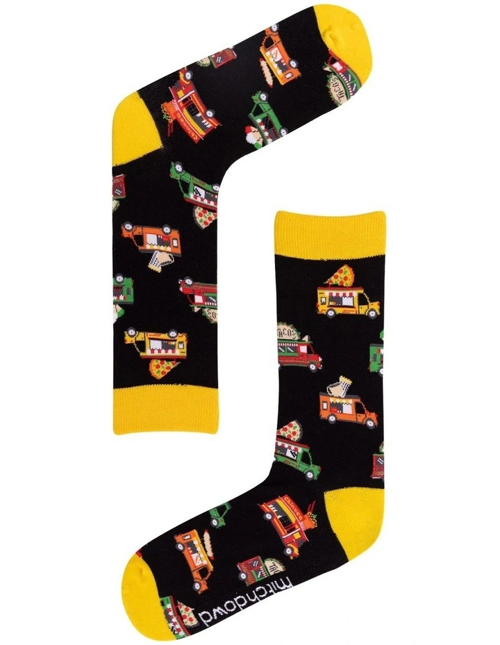 Look stylish in these fun Mitch Dowd Men’s crew socks featuring an all over Food Trucks design and contrast colour toe, heel and double ribbed cuff. Great for everyday wear or the perfect gift idea.