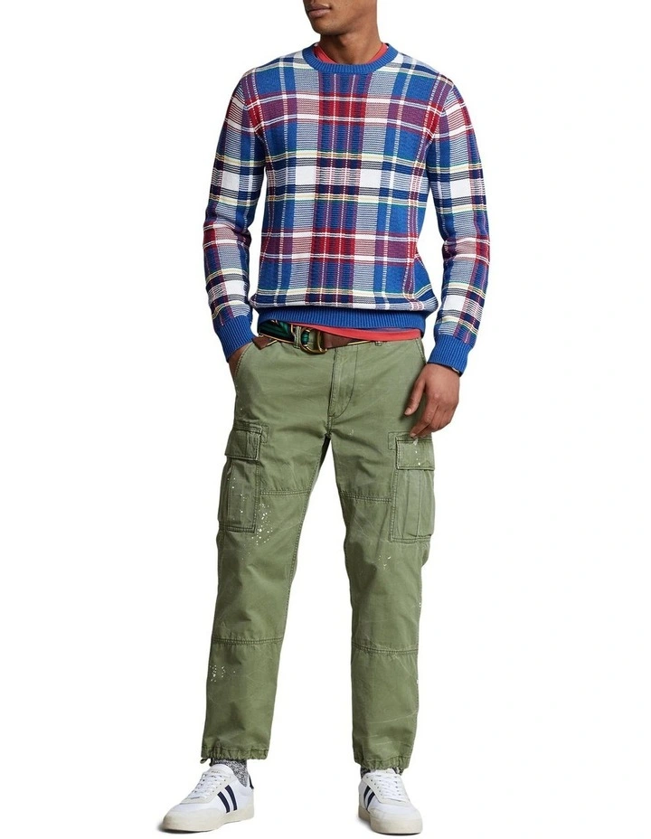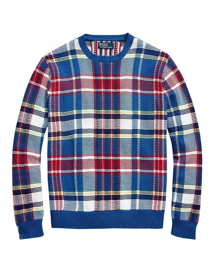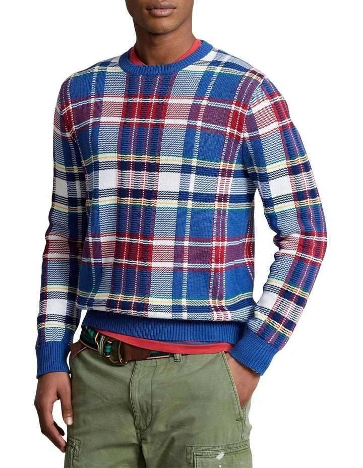 Crafted using six cotton yarns in different colors, this chunky-knit sweater features a bold plaid pattern that was inspired by a vintage woven shirt.
