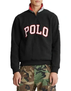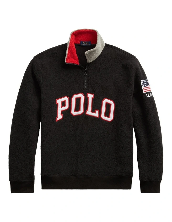 In soft brushed fleece, this sweatshirt features our logo and Americana-inspired graphics for a look that’s thoroughly Polo.Size medium has a 27″ body length (front and back), a 19″ shoulder, a 45″ chest, and a 35″ sleeve length. Sleeve length is taken from the center back of the neck and changes 1″ between sizes.Contrasting mockneck. Quarter-zip placket.Long sleeves with ribbed cuffs. Historical American flag patch and “U.S.A.” embroidered at the left sleeve.Side on-seam pockets.Twill appliqus spelling out “Polo” at the chest.Ribbed hem.Shell: polyester. Cuffs and hem: cotton, polyester.