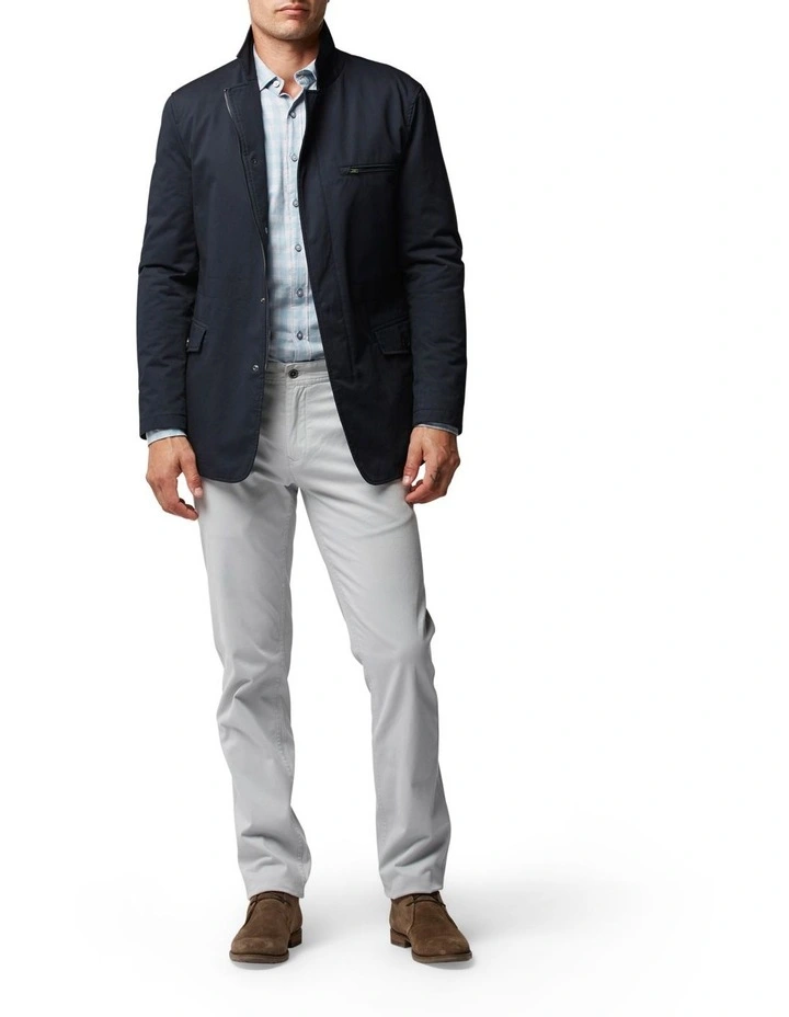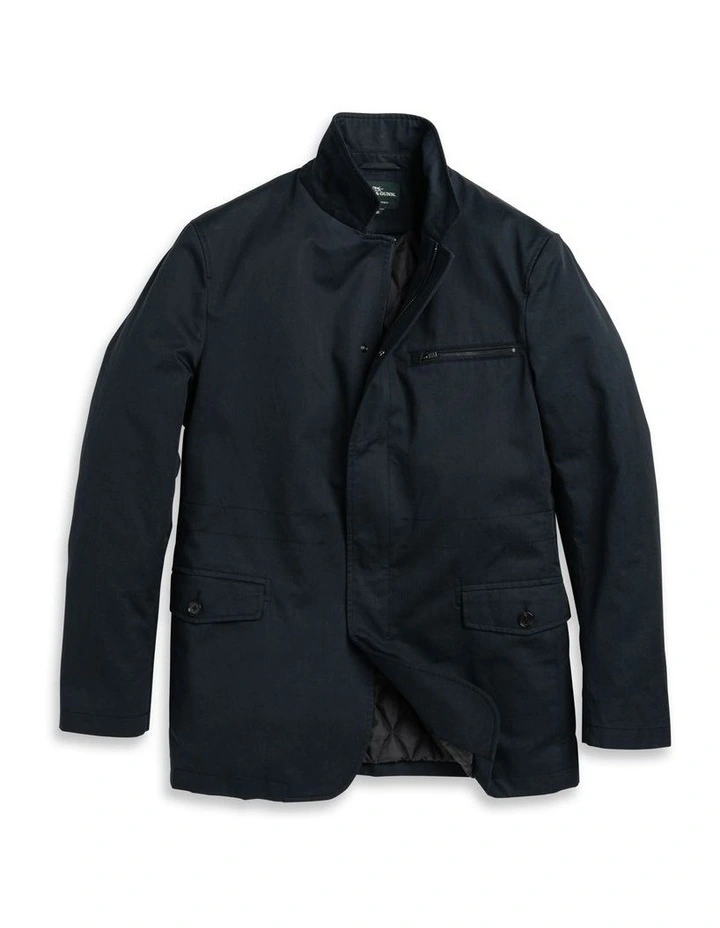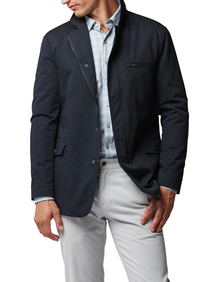 A hybrid traveller blazer crafted from compact cotton twill. A water-repellent treatment shields from the elements without impeding comfort of the fabric. A high performance insulation provides warmth whilst allowing for ventilation. Lined with a premium soft-touch lining at the interior.