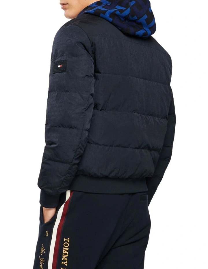 The seersucker bomber is crafted from a down fabrication with durable nylon outer. Featured a zip front, slanted side pockets, stand up collar and ribbed trims.