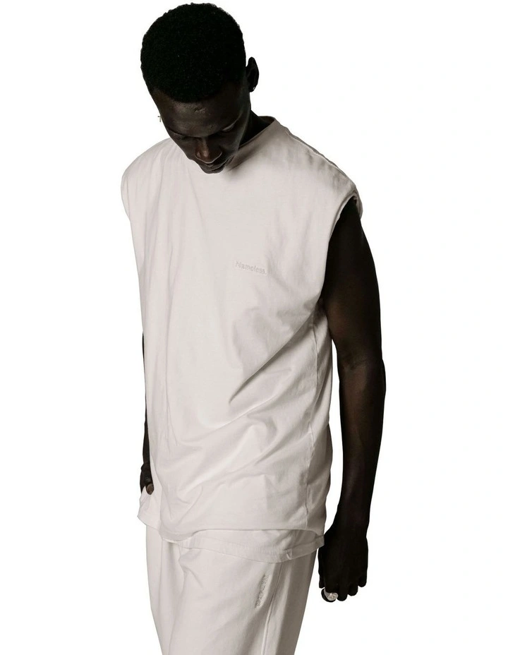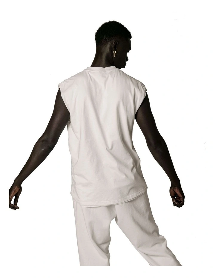 Donald s sleeveless twin. This is the one you want for summertime goodness. Dropped shoulder for that vintage retro look with cut off sleeved. Wear it smaller for a regular feel through the body or oversized for `the look?. On the neck with 23mm rib, 200gsm 100% vintage cotton.